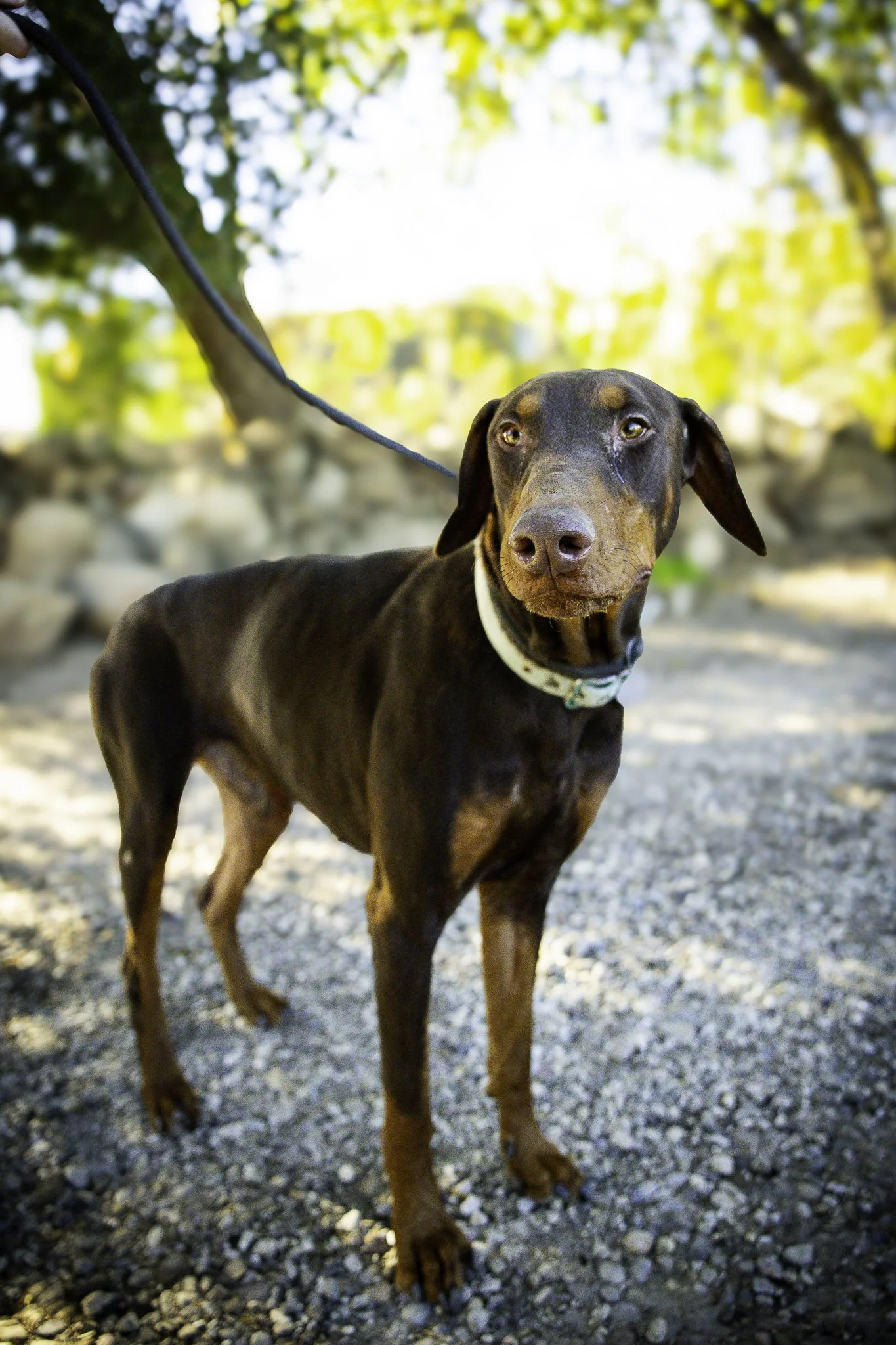 Bane is a handsome 3-year-old Dobie who is kenneled with another male Dobie and a female, and the dogs get along well together.  Of the three, Bane is the most reserved.  According to his ex-owner, who had relinquished him to an animal shelter, he loves to stay close to his person but is not particularly a snuggler.  (He slept at the foot of the bed, not next to the owner.)  He had lived with very young children in an apartment until his ex-owner unfortunately had life changes forcing her to live in her car.  Bane is housebroken, well-behaved, and had lived in the apartment with his brother - who was adopted from the animal shelter - compatibly.  It will take a little time and patience for him to believe that someone can care about him again, but he's worthy of that wait.